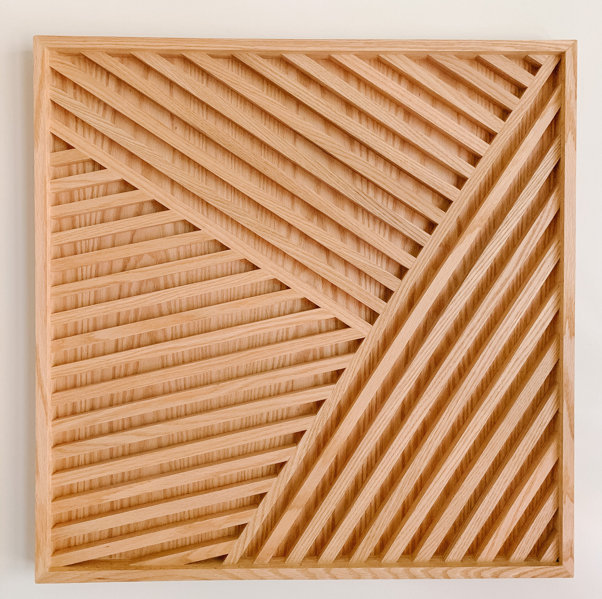 Oak & Rose canvases bring the warmth, beauty, and understated elegance of nature into your home. Oak is regarded as a rigid, un-manipulative material. But given the right eye, it has been transformed into an ever changing work of art. Each piece is worked by hand embracing the imperfections; the knots, color variations, and ring structure of the oak all vary from piece to piece while the lighting throughout the day seemingly changes the architecture of the design.